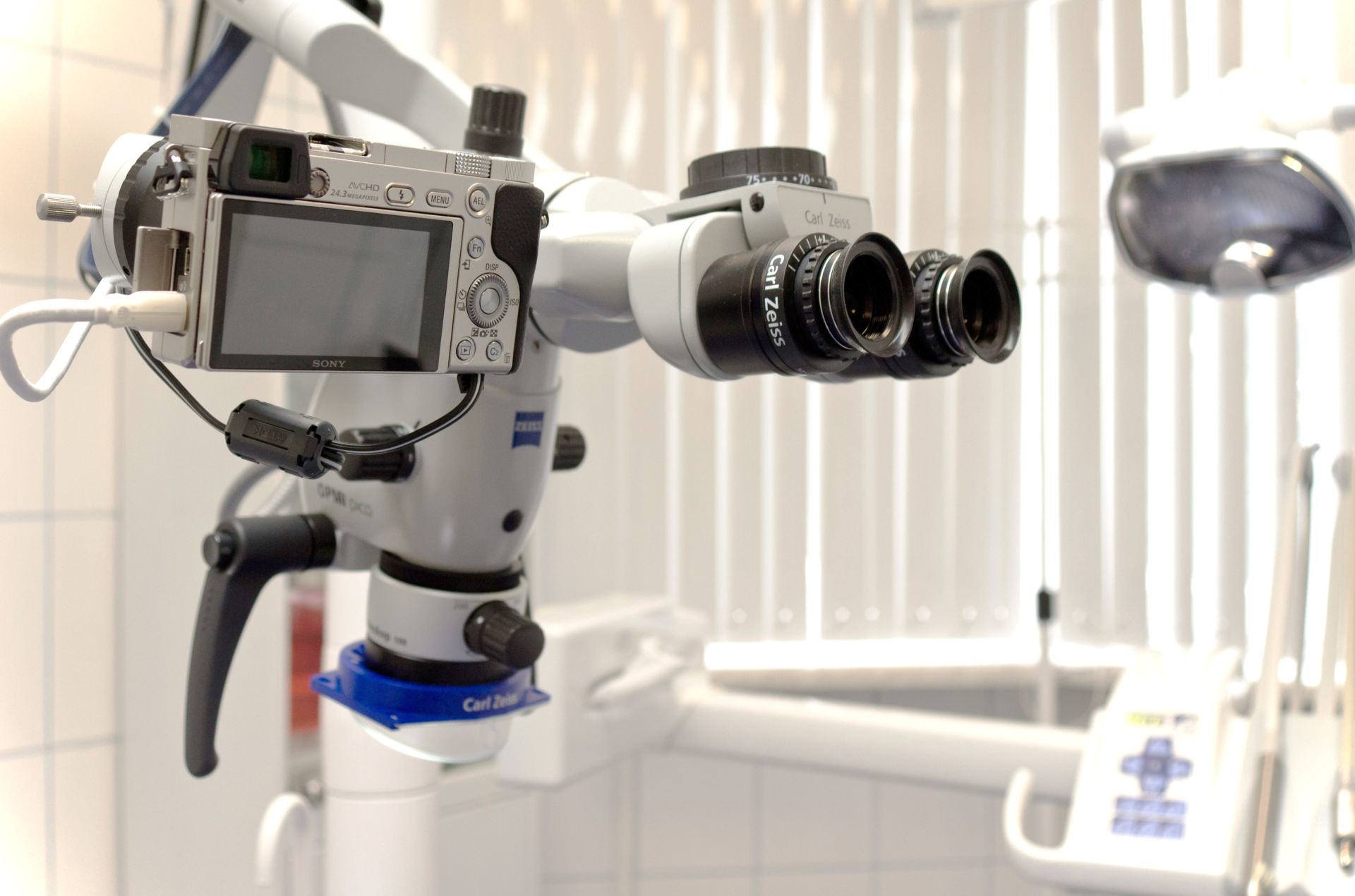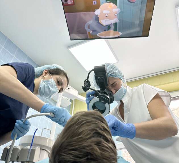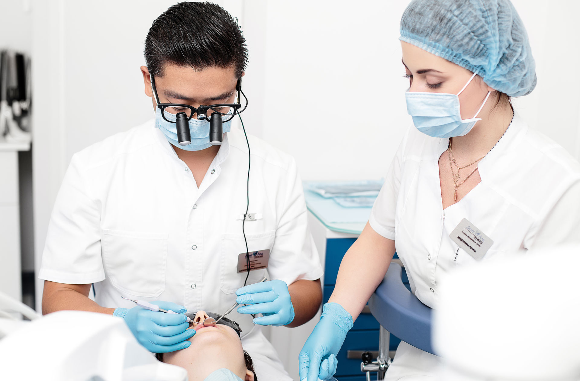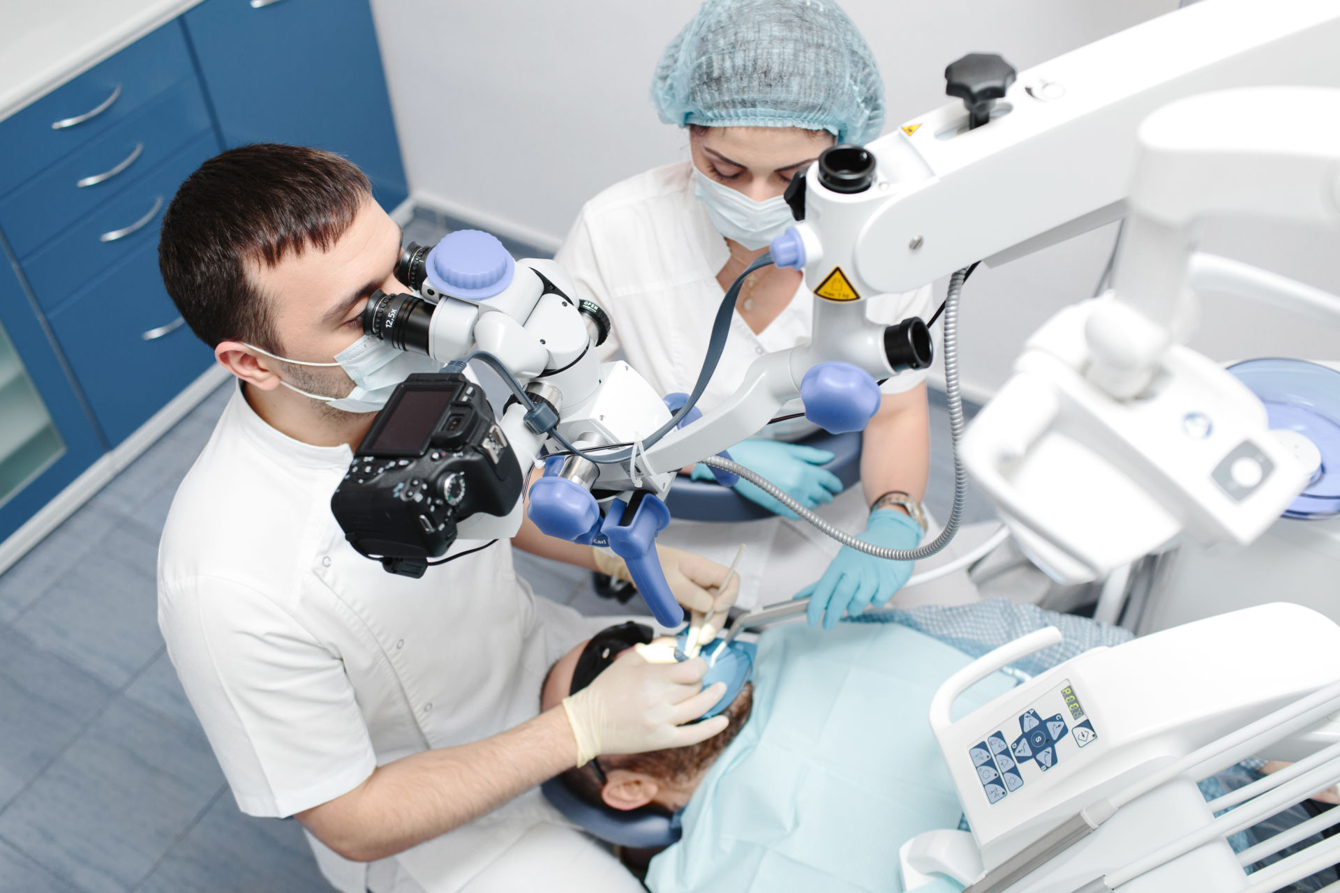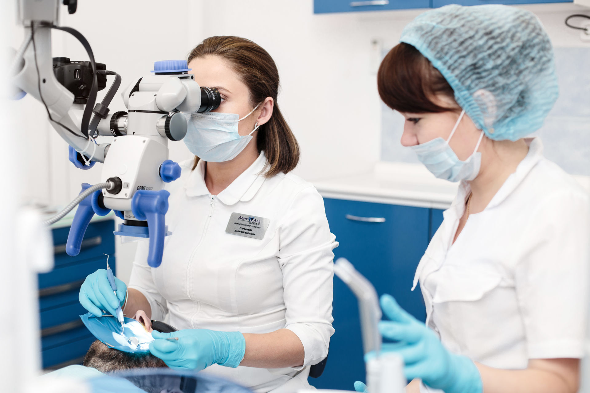 Лечение кариеса с постановкой пломбы под микроскопом, бинокулярами